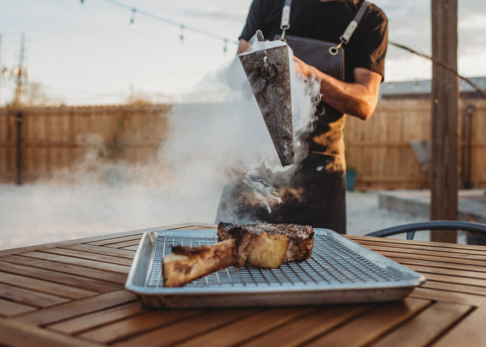 Chef smoke-finishing the tomahawk steak to deepen flavor while it rests.