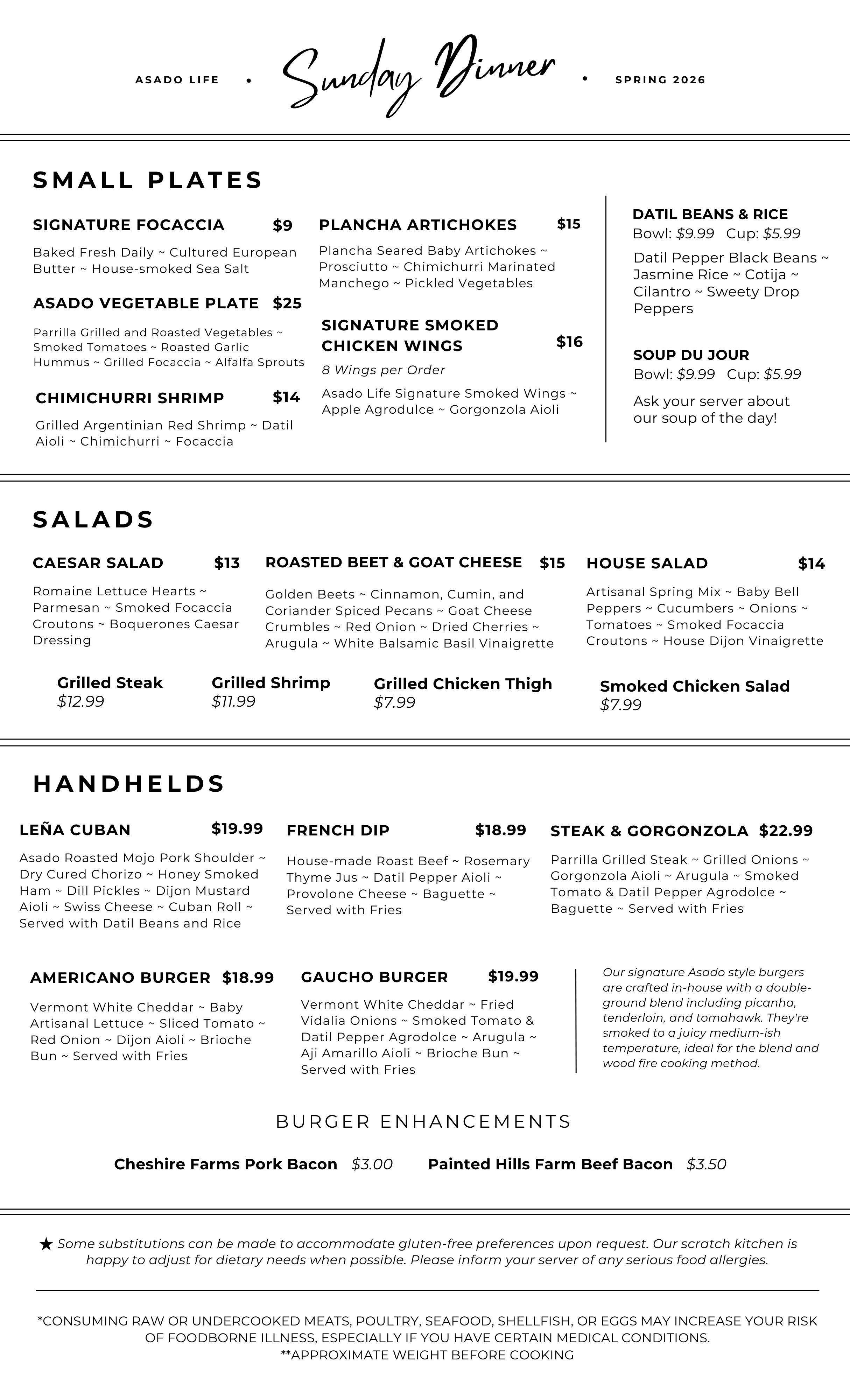 To maintain our live-fire cooking style and preserve the authenticity of the Asado experience, we offer select signature entrées for pre-ordering. These meals are prepared hours in advance and cooked low and slow, the only way to achieve the smoky, rich, bold flavors that develop over a longer grilling time. Must be ordered with your reservation by 10am day-of